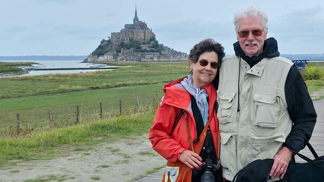 John and Virginia on the long walk to Mont Saint Michel.