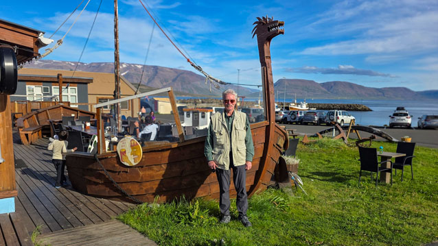 John in front of a replica of a Viking boat