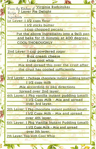 This 7 Layer Pie Delight is a great dessert if you're having company because make it the day before! Everyone loves it. You DEFINITELY need to make it 24 hours prior to serving it.
