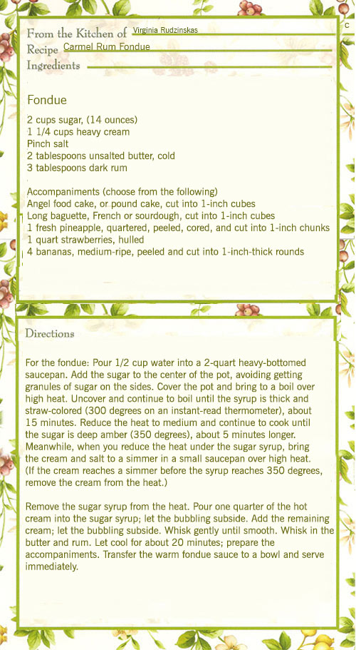 This Carmel Rum Fondue is fun! It's best to add a fair amount of water to the sugar to ensure even melting for this Carmel Rum Fondue, then cover the pot and cook it over high heat. The lid prevents crystallization because the trapped condensation washes the walls of the pot and removes any adhered sugar crystals that could cause the sugar to seize. Once the sugar is completely dissolved, remov the lid and lower the temperature to make it easy to gauge the caramel’s color. There’s a very fine line between a perfect golden-brown caramel and a bitter, burnt caramel. After adding the heavy cream, add a little butter, which mades its appearance more glossy and its flavor rounder, and spicy dark rum, which best matched the caramel’s flavor.
