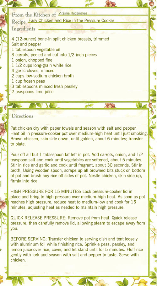 For the Chicken and Rice recipe, I used bone-in chicken breasts rather than boneless for better flavor and meat that stayed moist. Browning the breasts before cooking them under pressure discarded most of the fat before cooking. I decreased the normal amount of liquid to rice to account for the moisture released by the chicken and carrots that couldn’t evaporate. Stirring the rice made the dish gluey, so simply fluff it with a fork when incorporating the peas, lemon juice, and parsley.