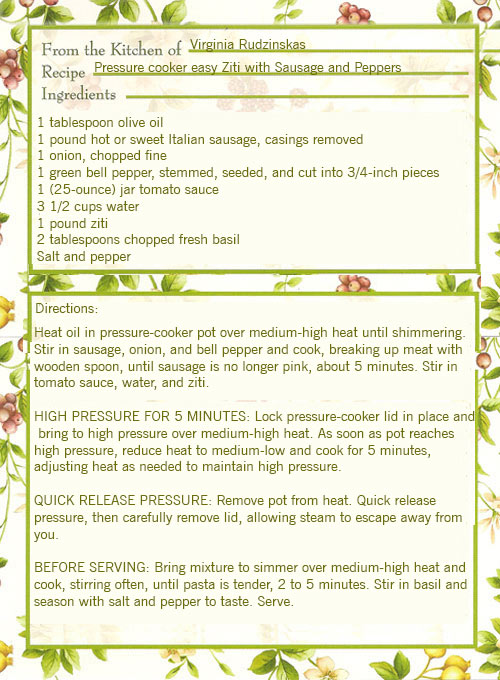 Pressure cooker easy Ziti with Sausage and Peppers recipe. For a one-pot pasta dinner that is streamlined without sacrificing flavor,start by browning Italian sausage, onion, and green bell pepper just until the sausage is no longer pink. Then stir in tomato sauce, water, and our pasta. Using jarred sauce kept things simple, while a tubular pasta like ziti proved to be the best match for the pressure cooker— strand pasta turns into unappealing clumps of noodles when cooked under pressure. Cooking the ziti for 5 minutes was the best approach to ensure it wasn't accidentally overcooked. (a likely problem when cooking pasta under pressure since you can’t check for doneness along the way). After 5 minutes, you quick release the pressure and let it all simmer for a few minutes to finish cooking the pasta through and concentrate the sauce’s flavors. A sprinkling of basil at the end made the right fresh finish for a saucy, meaty ziti dinner