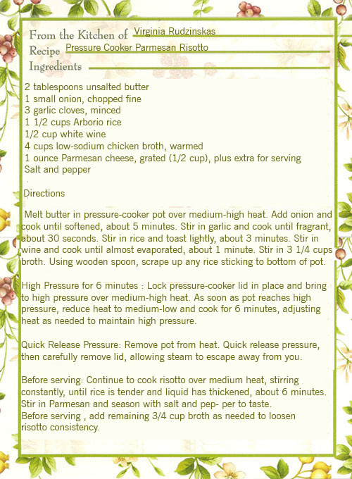 A dish that typically requires near-constant stirring, risotto is probably low on most lists of side dish options. But not for home cooks with a pressure cooker. After sautéing aromatics and toasting the rice for a few minutes, stir in wine, then broth. Then, instead of stirring for up to 30 minutes, you just lock on the lid and let the magic happen. Six minutes under pressure delivers risotto that is almost done. From that point, you simmer the risotto for a few minutes, stirring for just 6 minutes, until it was perfectly creamy. A little Parmesan was the only finishing touch needed for this simple recipe, although you may also garnish with parsley and shaved Parmesan, if desired.