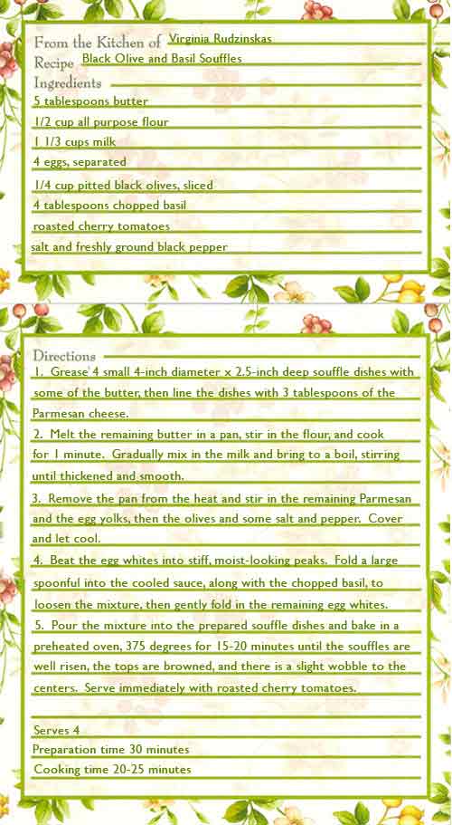 Deliciously light with a fluffy center....a fun Black Olive and Basil Souffle.